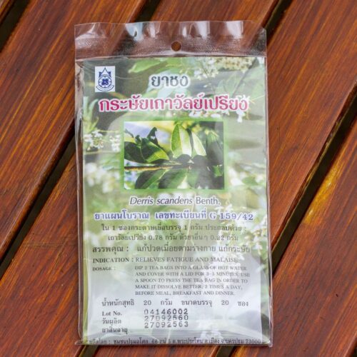 Derris scandens (деррис) – это древесная лиана из Юго-Восточной Азии, которую в традиционной тайской медицине активно используют для лечения от мышечных и суставных болей, а также снятия или уменьшения физической усталости и как противовоспалительное средство при артритах и артрозах. Улучшает кровообращение, нормализует повышенное артериальное давление, помогает при вегетососудистой дистонии, уменьшая симптомы в виде онемения конечностей и т.д.