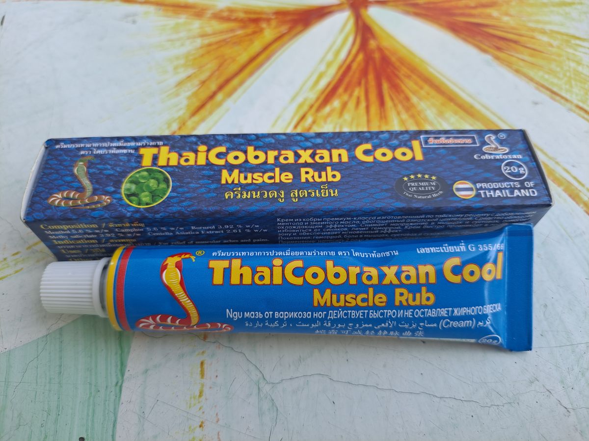 Мазь Тайкобраксан в синей упаковке подходит для широкого спектра применения. В Таиланде она очень популярна и находится практически в каждой домашней аптечке из-за своих полезных охлаждающих свойств и отсутствия побочных действий.