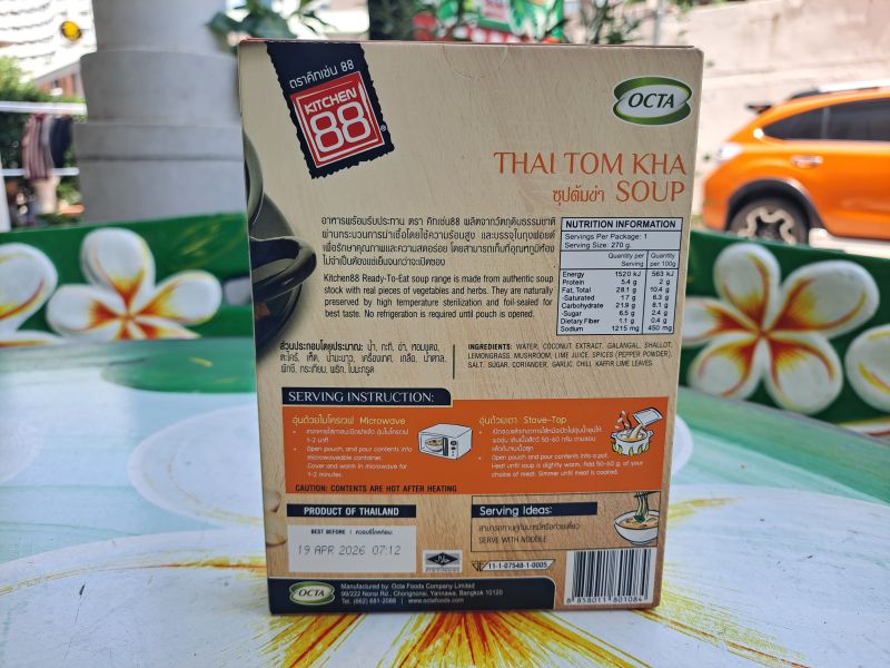Готовые к употреблению супы серии Kitchen 88 производят на основе настоящего бульона с использованием овощей и зелени. Они сохраняются естественным путем благодаря высокотемпературной стерилизации и запечатывания в фольгу. При этом хранить готовый суп Том Кха в коробке можно при комнатной температуре, нет необходимости в холодильнике. А после вскрытия упаковки её необходимо поместить в холодильник и съесть содержимое в течение 24 часов.