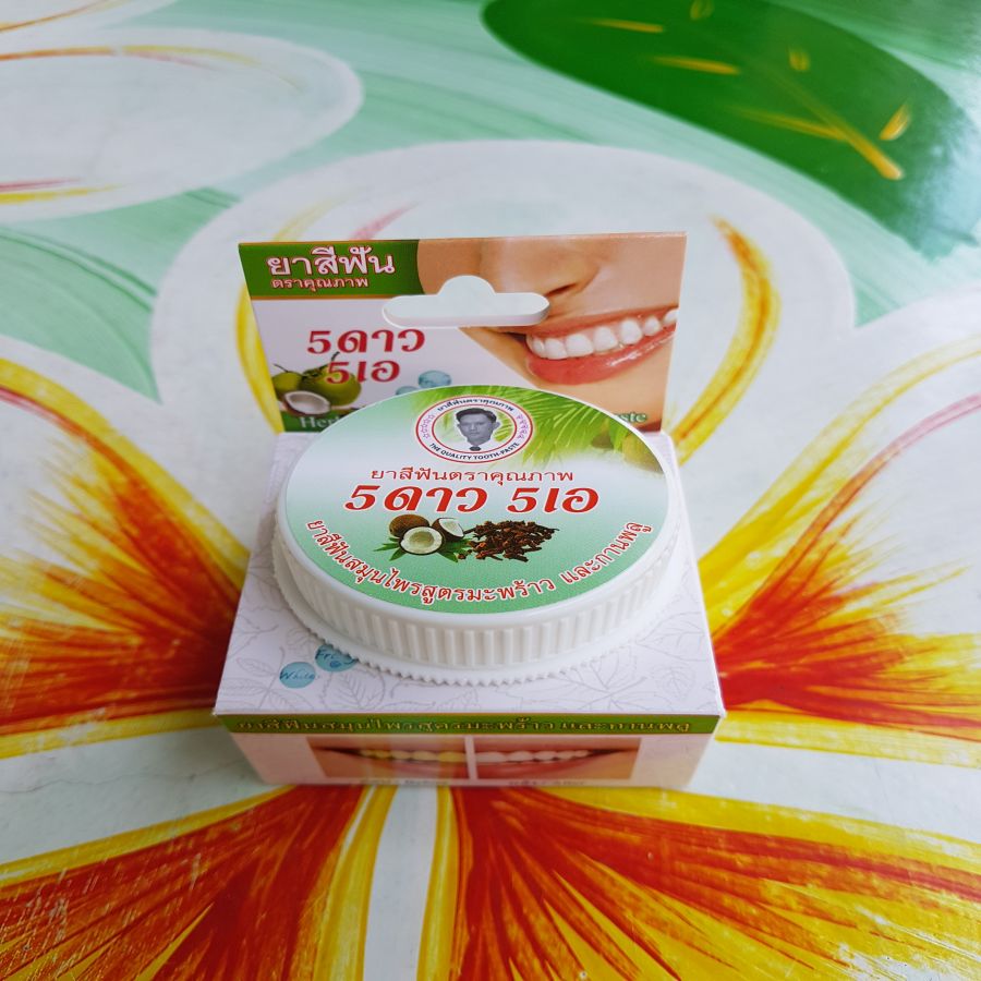 Легендарная тайская зубная паста в круглой упаковке марки 5 Stars обладает вяжущими и ранозаживляющими свойствами. Кокосовое масло в составе обеспечивает дополнительный уход за деснами, а эфирное масло гвоздики – сильное лекарство против зубной боли, способное тотально предотвращать кариес и приостанавливать его развитие.