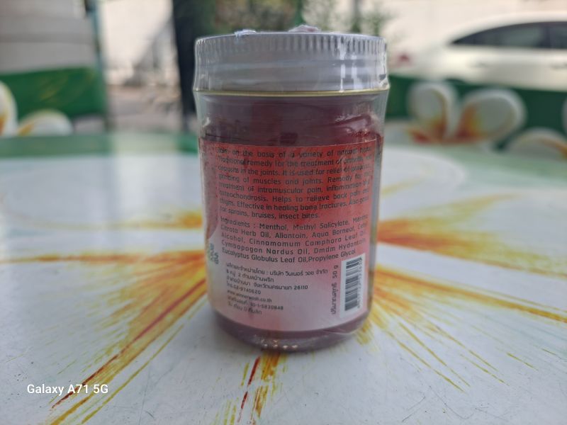 Красный тайский чудо-бальзам основан на различных травах с добавлением перца чили. Красный бальзам – традиционное средство лечения полиартрита, отложения солей в суставах. Применяют для снятия отеков и боли в суставах, помогает в лечении внутримышечных болей и воспалений.