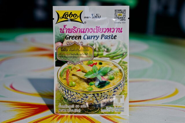 Готовая паста из специй для приготовления зеленого карри (Green Curry). Состав: чили, лемонграсс, чеснок, соль, лук шалот, галангал, креветочная паста, лимонник, кориандр. Упаковки достаточно для приготовления 1 порции (250 мл жидкости и 250 гр. мяса).