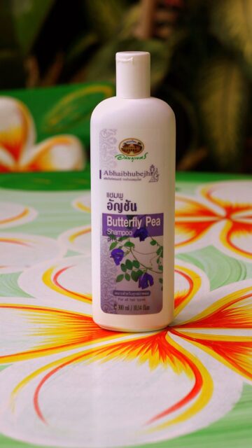 Для укрепления волос популярный тайский бренд натуральной косметики Abhaibhubejr предлагает шампунь с экстрактом цветов синего чая (мотылькового горошка, анчана) Butterfly Pea Shampoo.