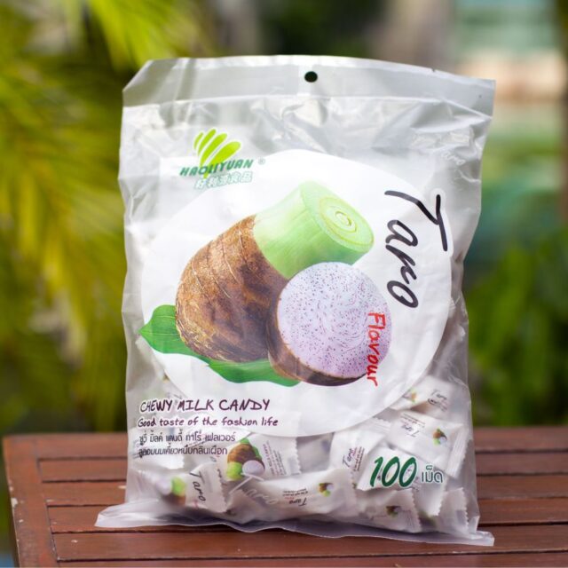 В Юго-Восточной Азии и в Африке растет экзотическое растение таро, клубни которого издавна используются в производстве кондитерских изделий и выпечки. Жевательные конфетки с мякотью таро обладают очень необычным вкусом, который сравнивают с орехово-сливочным кремом или фисташковым мороженым. Под тонкой ирискообразной оболочкой скрывается еще более мягкий кремовый слой – это конфетки “с сюрпризом”. Неповторимый приятный вкус нравится и искушенным любителям тайской кухни, и новичкам!