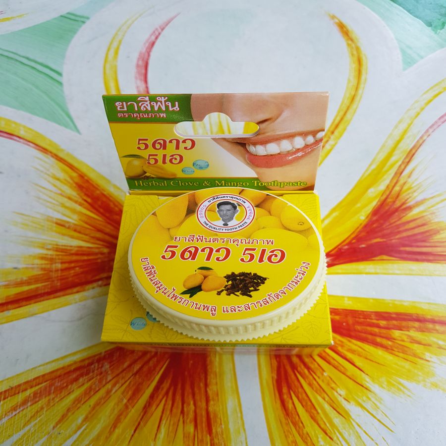 Круглая зубная паста 5 STAR с экстрактом манго легко очищает зубной налет, препятствует появлению зубного камня и развитию заболеваний ротовой полости. Благодаря наличию в составе пасты специальных активных компонентов дыхание вновь становится свежим, происходит укрепление зубной эмали и устраняются бактерии.